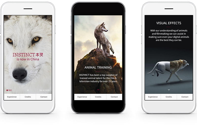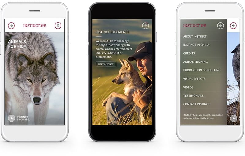 在任何项目中,了解目标受众都是首要任务。对于 INSTINCT 来说,目标受众是中国电影制片人。鉴于手机在中国的主导地位——超过 95% 的互联网用户通过智能手机上网,我们决定将 INSTINCT 的中文网站设计为移动优先,针对中国导演或制片人在寻找动物演员时的优先需求来呈现信息。