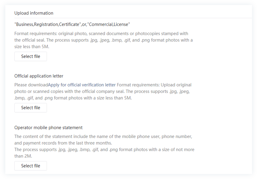 如果您还有其他法律文件需要提供,例如公司座机账单、营业许可证等,可以在此验证过程中上传这些文件。