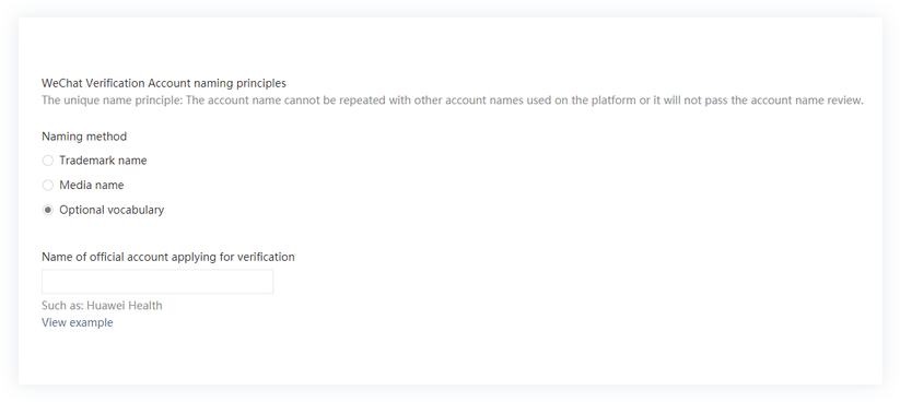 - 否则,选择可选词汇选项,这样可以自由设置您想要的微信官方账户名称。