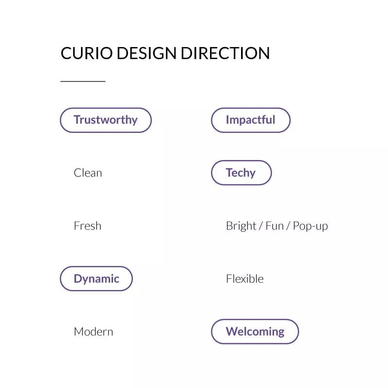 通过Curio团队在问卷中的深思熟虑的回答和多次对话,我们制定了一个包含10个描述词的列表以推动设计。随后,我们要求Curio团队共同选择出5个最能体现Curio文化的描述词。
