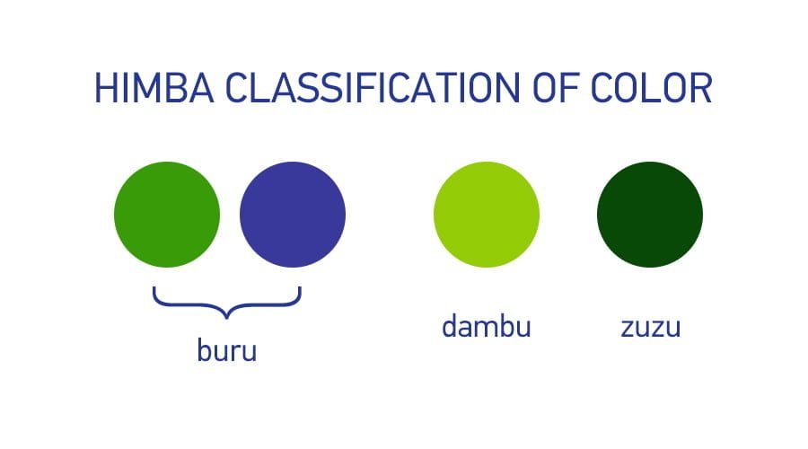 有趣的现象是,不同文化背景的人对同一组颜色使用不同的名称。在一些研究中发现,文化差异可能导致不同文化背景的人对同一颜色的称谓不同。例如,纳米比亚的汉巴族成员使用独特的词汇来区分一些西方人无法分辨的颜色阴影。同时,汉巴族人在识别颜色时,面对明显的颜色差异却可能感到困难。由此产生的问题是:我们使用的语言以及所属文化是否影响我们看待颜色的方式和我们能够看到的颜色?