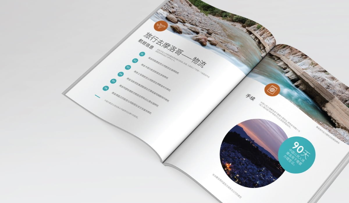 由于视觉识别系统深受摩洛哥风景和传统艺术的启发,它与宣传册中展示的摩洛哥美丽风景和地标自然契合,完美呈现了旅游线路的独特魅力。