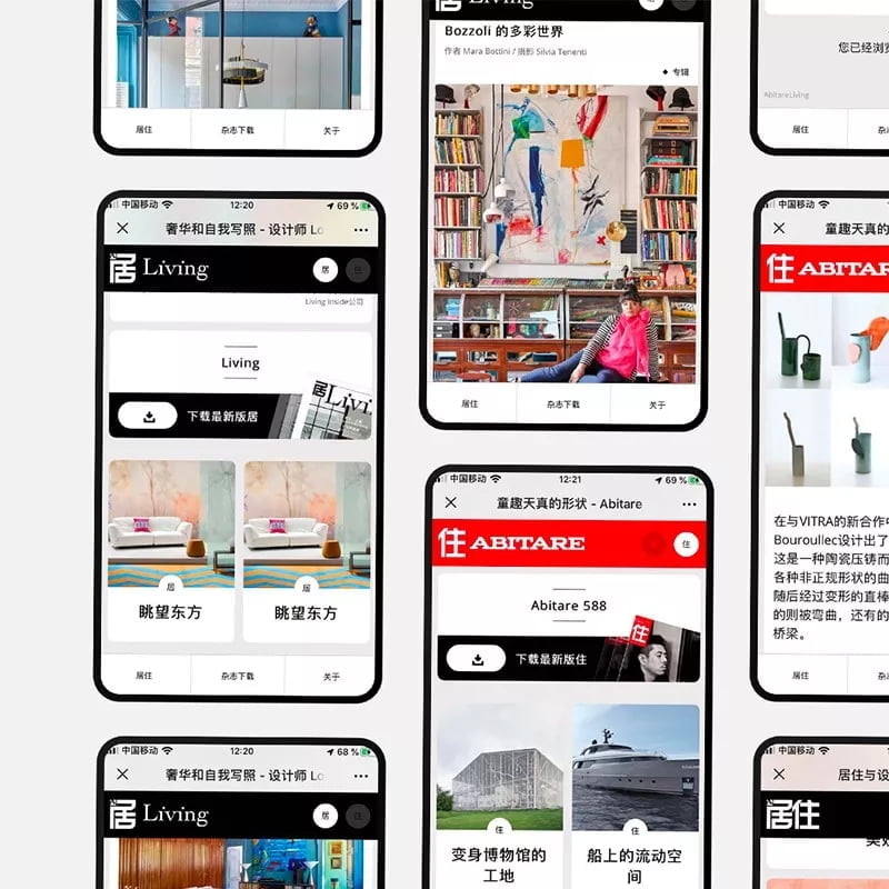 意大利设计的沉浸感通过高质量的图片和简单直观的布局得以呈现。在这个环境中,读者可以浏览本地化的中文文章、出版物,当然也可以了解更多关于Abitare和Living的信息。