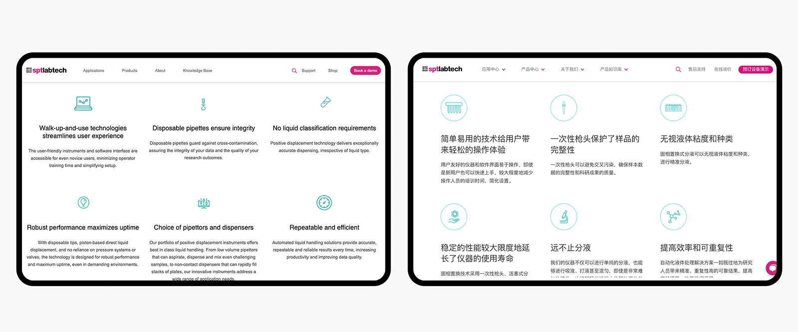 当SPT Labtech的线上主管John联系我们为他们全新的国际官网进行中国本地化建设时,我们立刻觉得这是一个让人兴奋的项目:分工明确的国际公司、专业的网站文案撰写者、专门负责对接的中国团队、雄心勃勃的客户和优秀的品牌视觉识别系统——项目要素一应俱全。历经数月,SPT Labtech全新的国际网站和中文网站成功上线。
