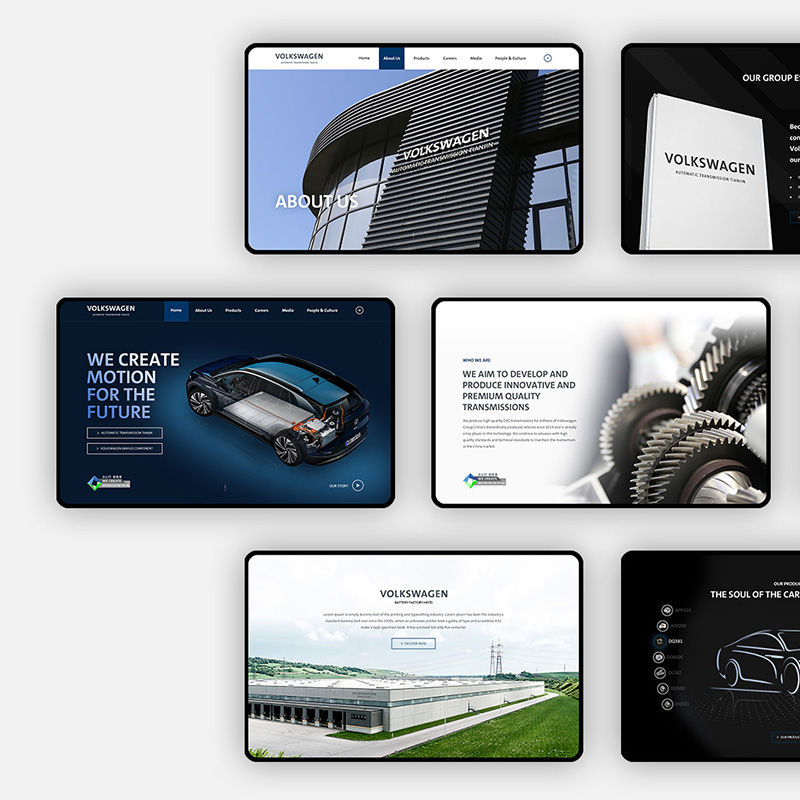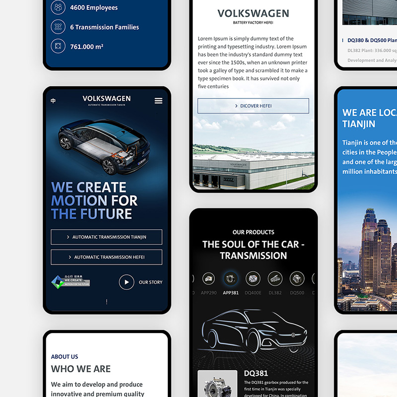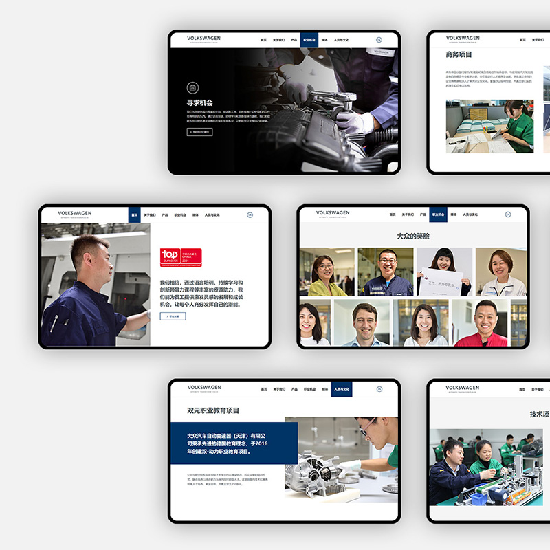 该网站项目的主要目标受众是有意愿加入大众汽车自动变速器(天津或大连)的潜在员工,所有设计元素传递的视觉感受应该是积极正面的,每一张精心挑选的图片都应服务于网站内容的视觉延展。例如,在企业文化与社会责任的介绍中,应充分考虑网站受众的感受,通过网站视觉传递企业的可信赖感。
