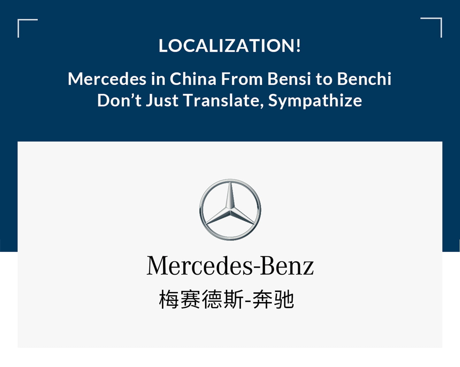 当梅赛德斯首次进入中国市场时,他们使用了发音类似创始人名字的中文字符“默谢台斯-本茨”,这在中文中是个绕口令。不幸的是,最后两个字符“本茨”听起来非常接近“奔死”,导致了一些负面的联想。