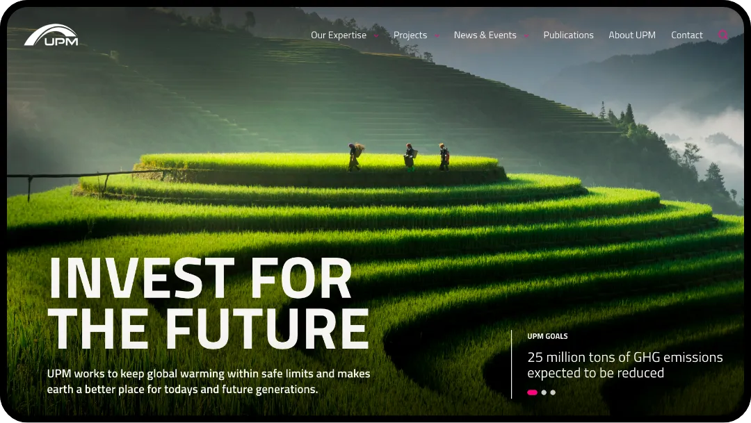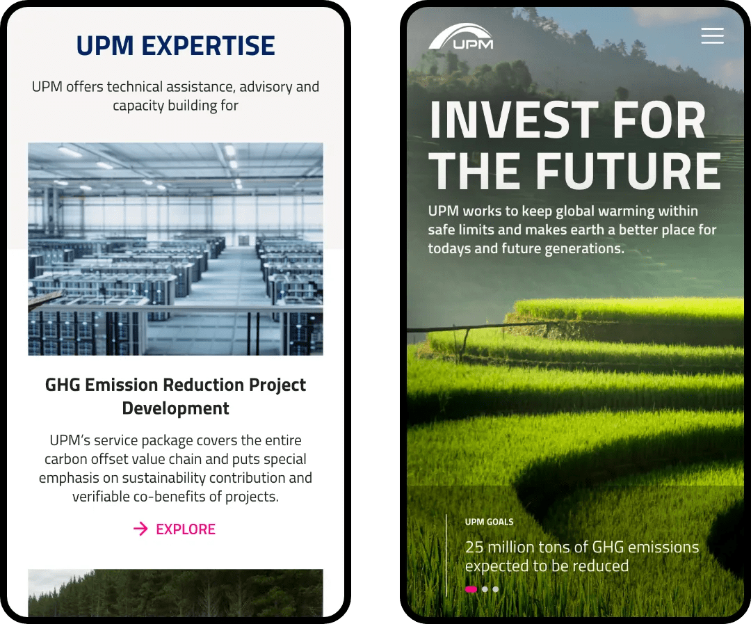 因此,当我们的长期合作伙伴玛丽再次联系到我们,邀请我们为 UPM 重新设计网站和宣传手册时,我们感到十分欣喜。早在2018年,我们就为 UPM 设计了其官网,并持续提供维护服务至今。这次的网站重新设计合作不仅顺利且愉快,还进一步促成了 UPM 旗下另一个网站的重新设计项目。