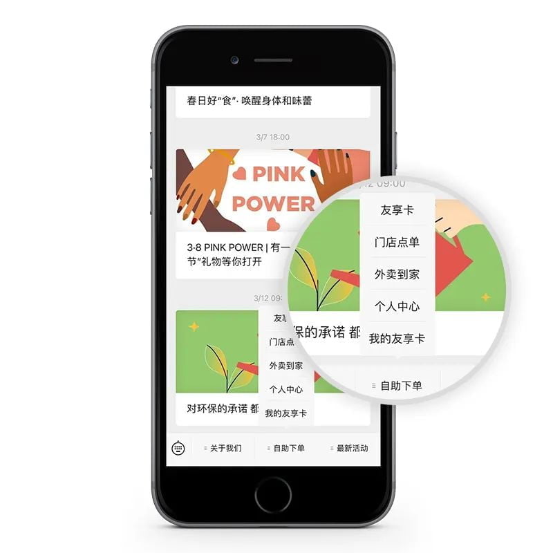 尽管菜单只对访问过微信公众账号的用户可见,并不一定有助于初期的账号曝光,但它可以引导用户经历丰富的品牌体验之旅(例如,小程序、迷你网站)。